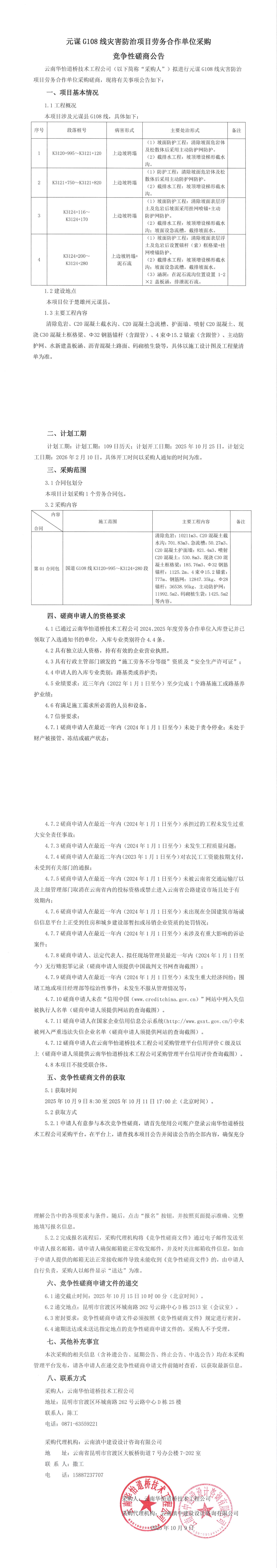元谋G108线灾害防治项目劳务合作单位采购竞争性磋商公告